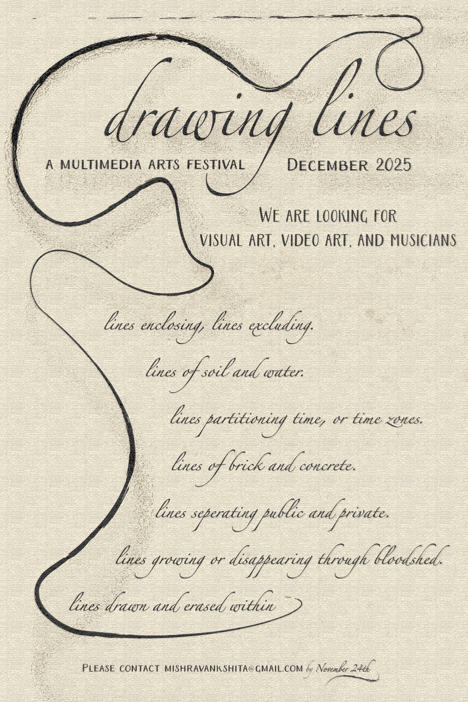 We are looking for visual art, video art and musicians.
